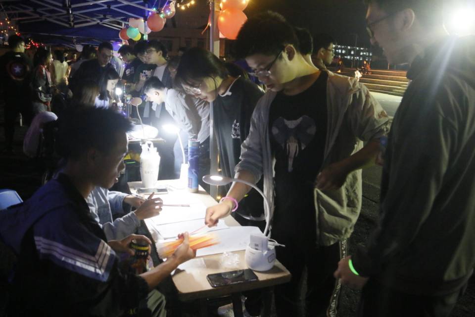 活动开始前,同学们纷纷到自己所对应的帐篷签到并领取荧光手环,随后主持人邀请扬帆社负责人马亚博老师代表发言,发言完毕后参与活动的老师和扬帆社理事会成员共同领跑,荧光夜跑活动正式开始。扬帆社成立的安全工作小组在操场内外跑道边设点站岗为大家保驾护航。青春洋溢的同学们带着荧光手环在操场中有序奔跑,每奔跑五圈即可领取一个荧光手环,超过18圈即可领取一个荧光头饰,随着活动的进行,同学们领取到的越来越多的荧光手环及荧光头饰使得操场上的夜色变得越发明亮起来。本次活动随着时间的推移逐步推向热潮,历经3个小时,主持人在22点宣布活动结束,工作人员统计同学们的圈数后根据名次奖励相应的奖品,随后扬帆社全体成员合影留念。