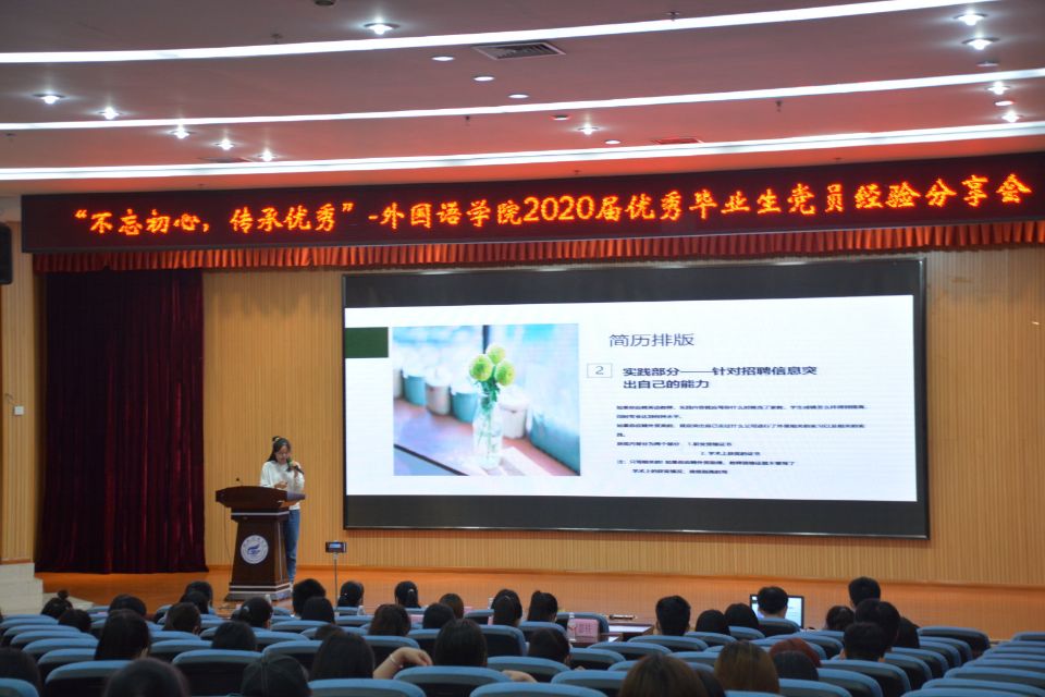 为充分发挥党员先锋模范作用,2020年6月9日晚上7点半,外国语学院党委在雁山校区图书馆报告厅举办了2020届外国语学院优秀毕业生党员经验分享会,以此来激励低年级同学们向先进看齐。学院党委副书记、学生第一支部书记邓洁琼老师、学生第二支部书记梁璇老师、研究生支部书记陈欣老师、16级辅导员蒋玄老师、19级辅导员陈永梅老师作为嘉宾出席此次活动。