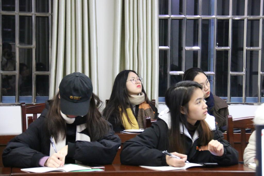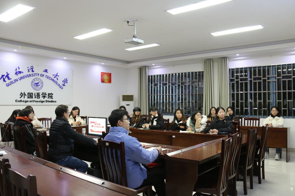 欣逢新时代,为响应把握好新时代的要求,发挥我院党员队伍的先锋模范作用,积极主动阐释好中国道路、中国特色,2020年12月7日晚上20时,外国语学院学生第一党支部于雁山校区04204室组织开展了党员“用好中国英语,讲好中国故事”主题双语党课活动。会议由学生一支部副书记韦运垌主持,学院副院长胡金老师主讲,学生一支部全体18级预备党员及发展对象参加学习此次党课。