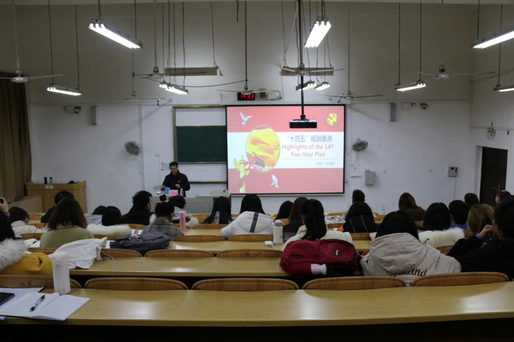 党课伊始,主讲人朱建斌老师通过介绍“十四五”规划的出台背景,切入主题,点明本次双语党课的主要内容。接着,通过对“高质量发展”、“经济发展目标”、“共同富裕”以及“全面建成小康社会”等的讲解,加深了全体学生党员对“十四五”规划的了解,并强调“十四五”时期要以高质量发展为主题,防范化解各类风险隐患,积极应对外部环境变化带来的风险挑战。要求全体学生党员加强对理论知识及“十四五”规划纲要的学习,紧跟时政,做合格党员。最后,朱建斌老师针对讲解内容中的时政热词,做了详细的翻译讲解,加深了全体学生党员对本次党课的印象。至此,本次党课顺利结束,全体学生党员受益匪浅。