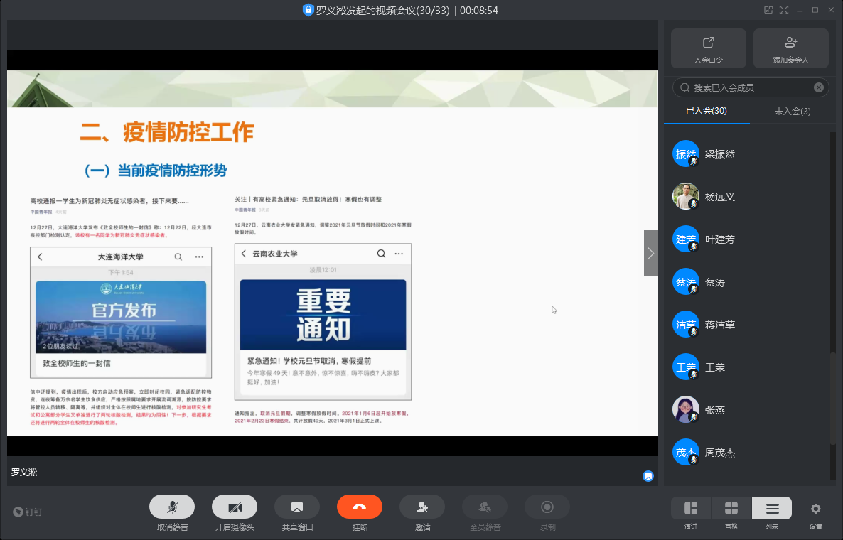 为扎实做好学生安全教育管理工作,12月31日,旅游与风景园林学院通过钉钉召开了班主任工作视频会议,学院党委副书记罗义淞以及学工办全体辅导员和全体班主任参加本次会议,会议由党委副书记罗义淞主持。