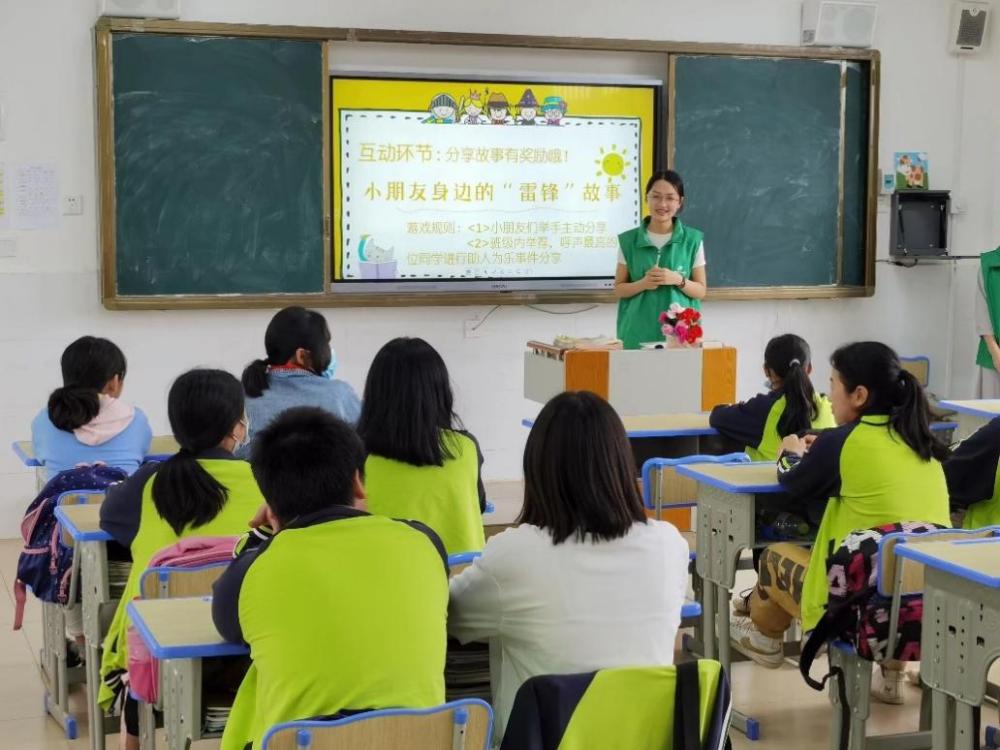 由环境学院团委·学生会的20名志愿者组成的支教团于4月15日12:50统一乘车前往北芬小学,下午14:00开始授课,本次共有4个班级参与活动,主要围绕传承雷锋奉献精神,践行环保理念的为主题,课堂上支教团的成员们为小学生们介绍了雷锋的英雄事迹和保护环境的相关知识。课堂上,同学们求知若渴,积极踊跃地回答问题。