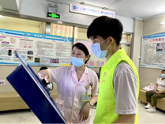 活动开始,学生志愿者在医院工作人员的介绍下,了解了医院的工作区域分布情况。经分组后,各学生志愿者分别在相应工作岗位进行后续培训。之后,部分志愿者在医院门口引领群众进医院前出示健康码,规范佩戴口罩,测量体温;大厅志愿者在导医台,解答病患挂号和缴费等问题;其他志愿者均在引导群众就诊的志愿服务岗位上,协助护士老师开展填写病人信息表、将病理样品送检验科和维持各环节的就医秩序等工作。