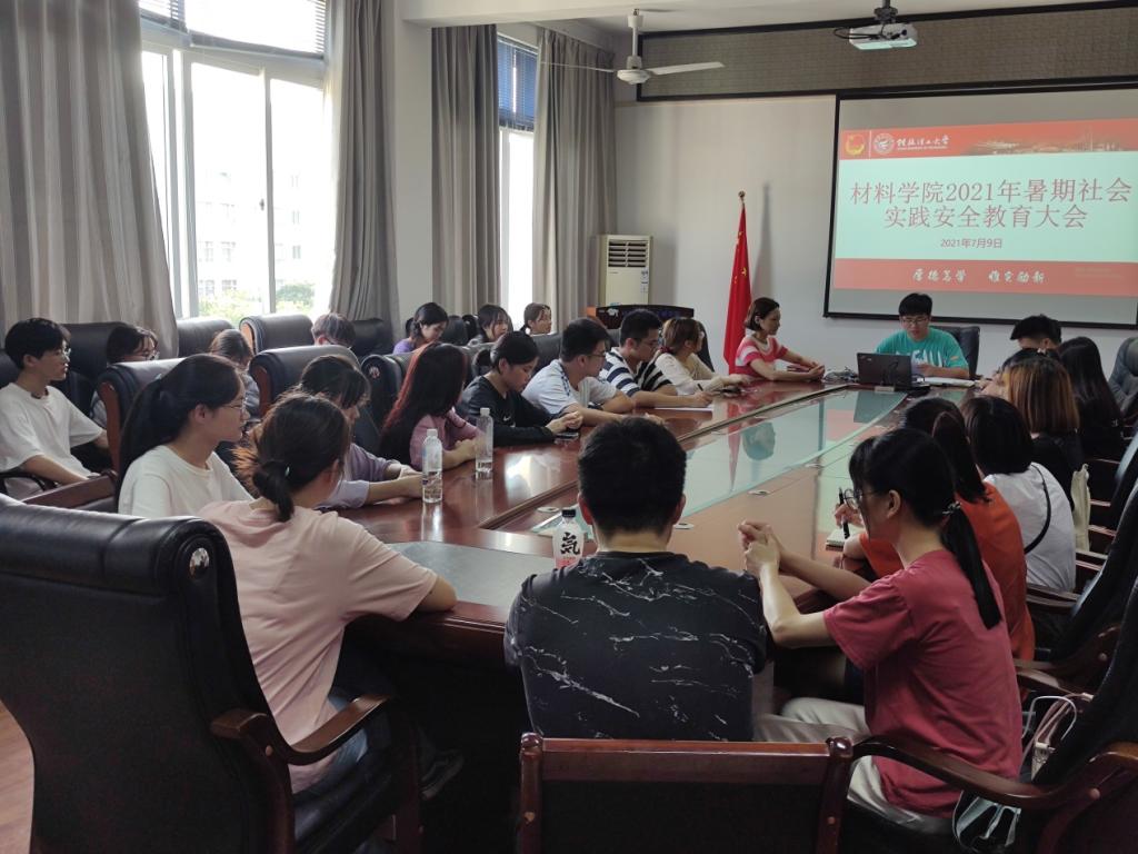 为做好2021年暑期社会实践工作,确保实践活动顺利安全开展,材料科学与工程学院于7月9日晚在屏风校区2308会议室召开2021年暑期社会实践安全教育大会,学院党委副书记徐时、各带队指导老师、暑期社会实践团队成员参加会议,会议由学院团委副书记(兼)卢桂盛主持。