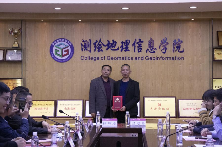 学院党委副书记周明权对本次校外企业导师聘任仪式作了致辞,他对受聘的企业导师及企业界人士对学院人才培养工作的关心支持表示感谢,对学院开展校企人才培养合作共建共育的意义与目的作了深刻地阐述。他指出,学院党委高度重视学院本科人才培养质量,通过企业导师平台,借助企业家帮助学生在思想品质、学业就业、实习实践、人才培育、技术能力等方面进行长期指导,发挥企业在管理、社会实践、职业发展、科技成果转化等方面的作用,促进学生早日成才。聘任仪式上,学院党委书记、博士生导师李景文教授为13名第二期校外企业导师颁发了聘书。随后,广西纵观测绘地理信息有限公司董事长覃思毅先生作为企业导师代表作了发言,他对学院开展企业导师入校,推动校企联合培养人才的做法给予了高度的赞赏,并表示将尽最大努力履行好企业家的社会责任,为学院教育事业与人才培养工作贡献应有的力量。最后,学院党委书记李景文作了总结讲话,他指出,企业导师是学生成长之路上重要的人生导师,通过企业导师这一纽带,架起了企业与学校、学院以及学生沟通的桥梁,打通人才培养的第一公里,有助于培育“思想政治过硬、专业素质优良、实践能力超强、创新能力突出”的新时代中国特色社会主义事业建设者与接班人。聘任仪式后,学院师生与企业导师进行了座谈,就校企联合人才培养的思路、模式及路径等问题进行了深入的交流。