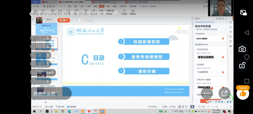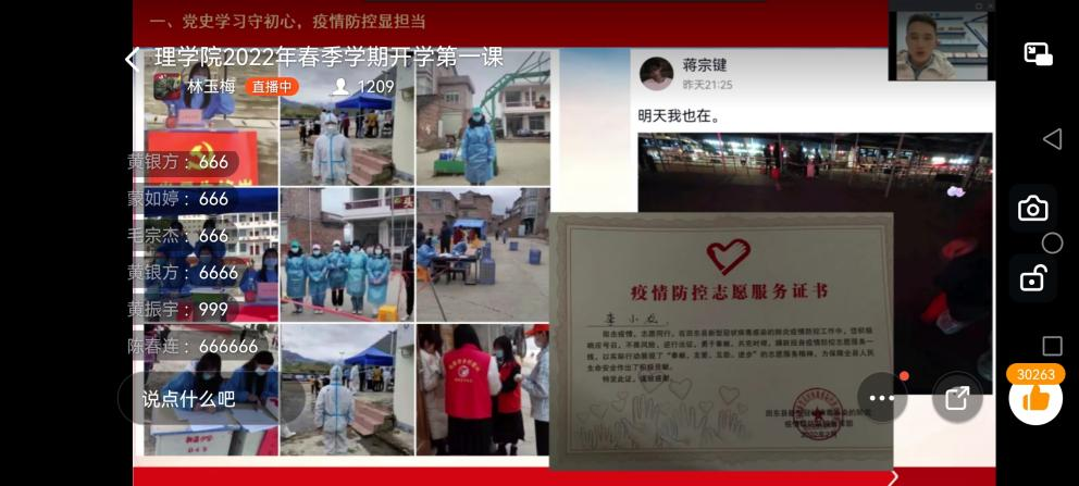 为深入贯彻习近平总书记关于“大思政课”建设的重要指示精神,落实学校2022年春季学期学生返校及疫情防控工作会议精神,进一步做好新学期开学安全稳定工作,助力学生扣好新学期“第一粒扣子”,2月27日,理学院各年级辅导员联合通过钉钉线上直播平台为全体本科生上了一堂思政教育的开学大课和安全教育的警示大课。