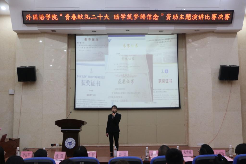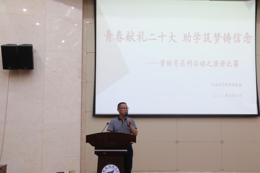 为大力宣传国家资助政策,培养广大学生诚信感恩、回报国家的优良品德,外国语学院于5月6日开展了以“青春献礼二十大,助学筑梦铸信念”为主题的资助月感恩演讲比赛。学院党委书记谢济光、学院院长唐渠、学院副院长朱建斌、英语21-4班班主任冯雪琦、英语21-6班班主任莫妍、2019级辅导员姚倩、2020级辅导员李林军出席本次比赛,100余名受助学生到场参加。