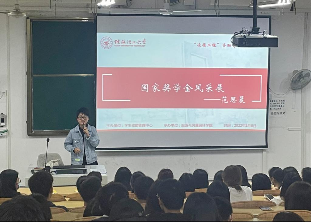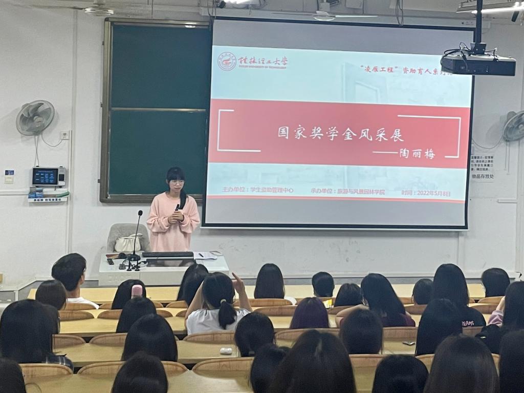 为推动学院的优良学风建设,树立学生榜样示范引领作用,5月8日,旅游与风景园林学院在雁山校区04620开展国家奖学金获得者经验分享交流会,学院学生代表124人参加了本次分享交流会。活动由辅导员唐兰主持。
