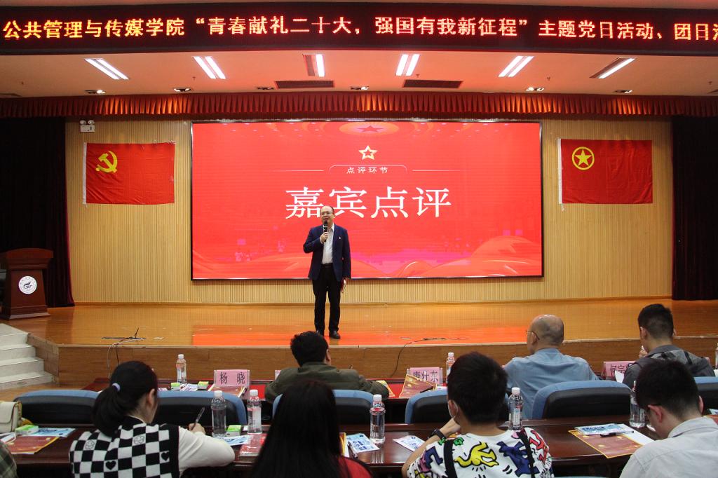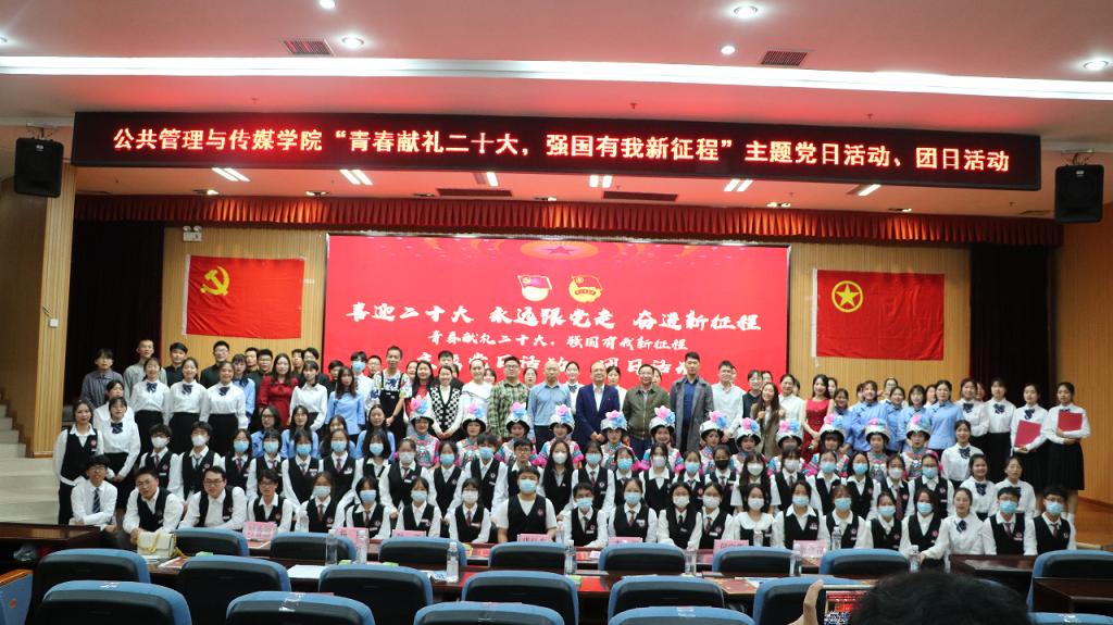 为进一步深入贯彻落实习近平总书记关于青年工作的重要思想,以迎接党的二十大为主线,结合庆祝建团100周年,形成党建带团建、党团共建争先创优好局面,公共管理与传媒学院于5月16日晚在雁山校区图书馆报告厅举办了“喜迎二十大、永远跟党走、奋进新征程——青春献礼二十大,强国有我新征程”示范性党日活动、团日活动。学校党委常委、组织部部长唐壮东,学校团委书记李雨等领导出席活动,并对活动进行指导。