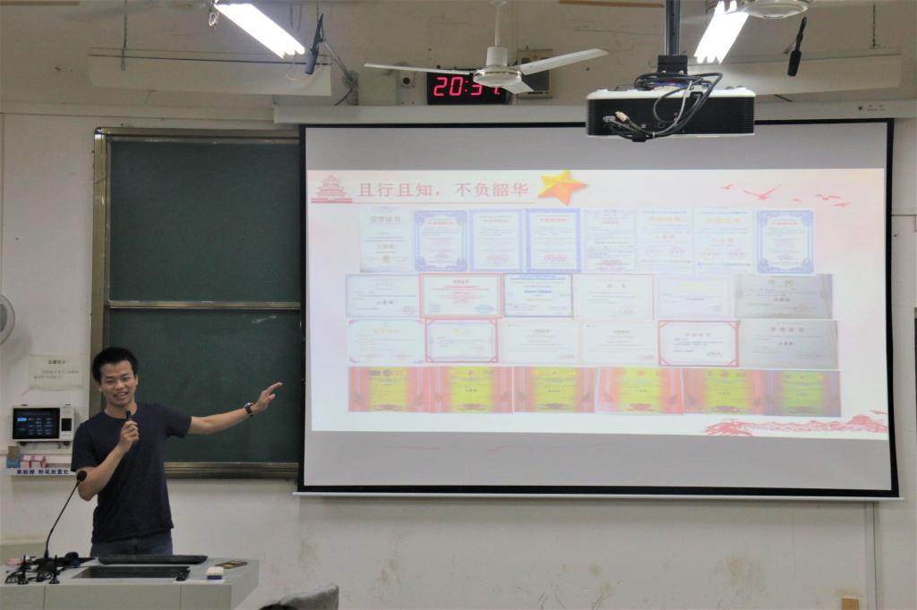 会议开始,李林军向学生介绍了本次分享会的主讲人许福培,许福培同学先后担任班级学习委员、学院辩论队成员、地质博物馆讲解员、南雁翻译社社长,荣获国家励志奖学金、2020年广西翻译大赛二等奖、2021年桂林市高校无偿献血表彰铜奖、2021年校园自强之星和学院励志之星等荣誉称号。接着,主讲人许福培上台进行事迹分享。他讲述了自己为讲解好桂工故事,在地质博物馆讲解的经历、暑期兼职赚取大学生活费的经历及为了努力提高自己的学习成绩如何拼搏进取的经历。当许福培同学展示自己的荣誉证书时,同学们纷纷为许福培同学鼓掌与点赞,现场氛围活跃。随后,主讲人许福培与同学们进行了现场互动,同学们积极举手发言,他耐心地回答了同学们提出的问题。