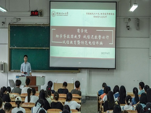 为进一步推进大学生思想政治教育工作,促进各项资助工作落地落实,6月5日,商学院利用大学生成长成才教育课堂开展“助学贷款圆我梦,诚信还款誓必行”诚信主题教育暨防范电信诈骗教育活动。
