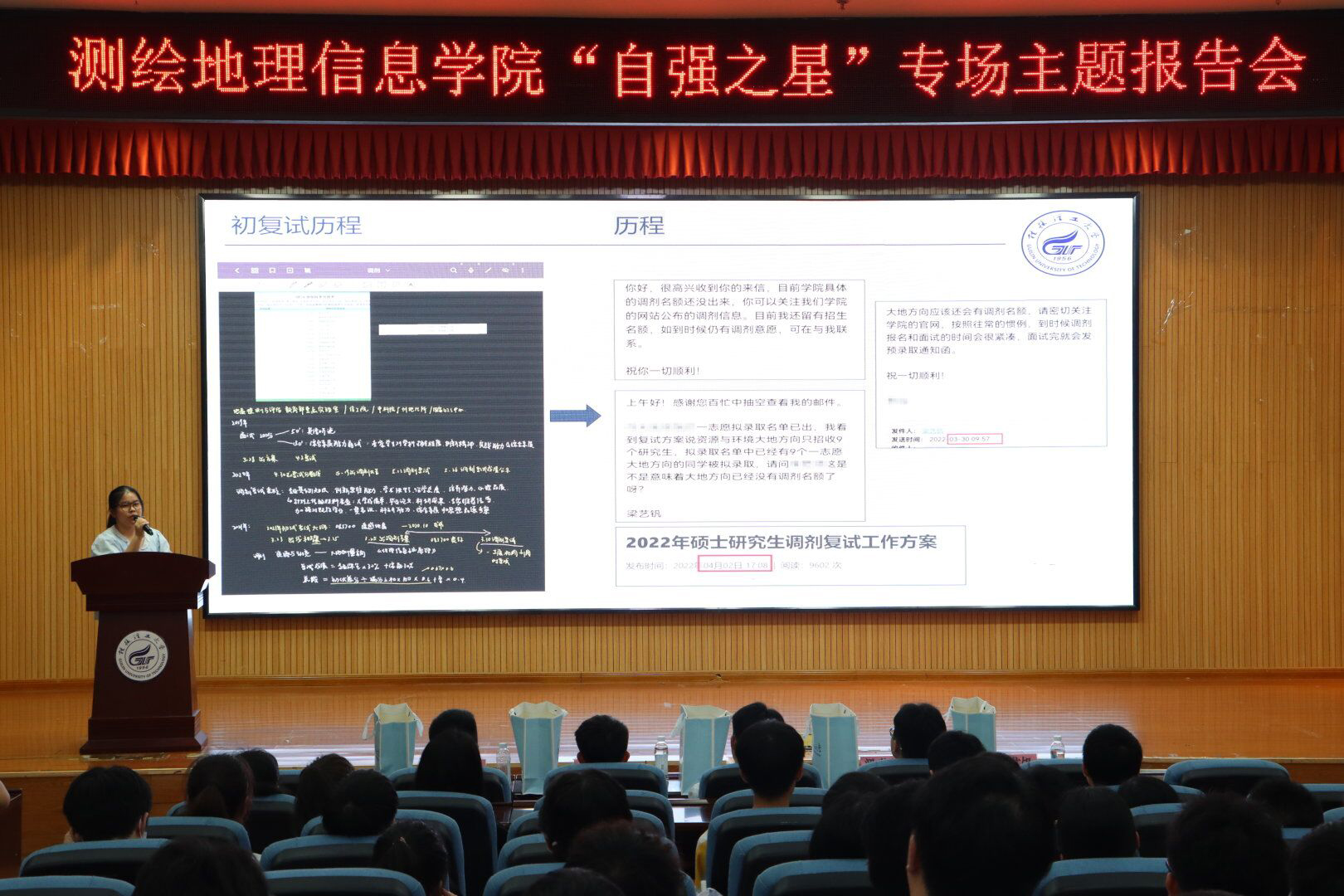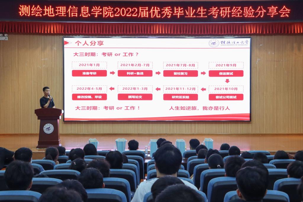 为鼓励动员学院学生立志考研,同时为备战考研的同学答疑解惑,6月16日晚,测绘地理信息学院在雁山校区图书馆报告厅举办了2022届优秀毕业生考研经验分享会,会议由2019级辅导员张铮海主持。