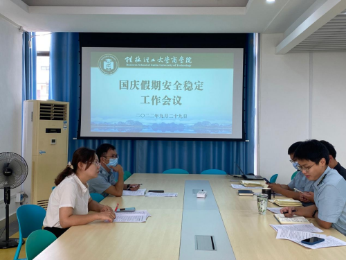 9月29日上午,商学院组织学院辅导员召开国庆假期安全稳定工作会议,雁山校区辅导员在7501会议室参会,屏风校区辅导员线上参会,会议由学院党委副书记沈菲菲主持。