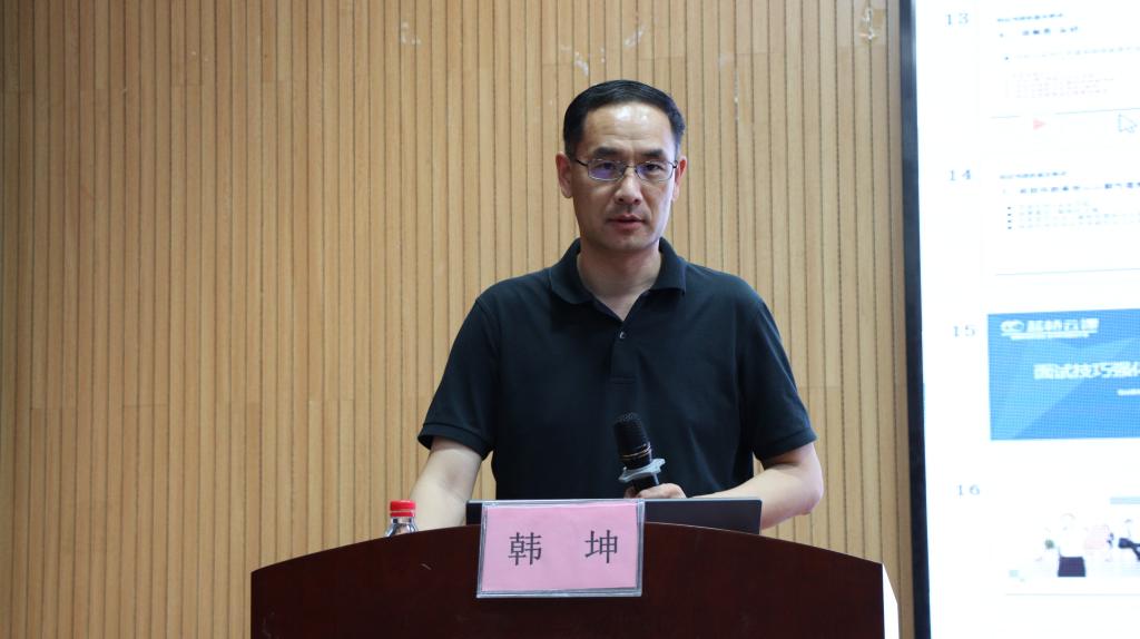 其次,韩老师从仪容仪表、心理准备和求职态度为同学们讲解关于面试需要注意的事项,从面试的主要形式、面试的流程、面试前的准备要素、面试考官的高频度提问、面试结束的收官流程等进行介绍。
