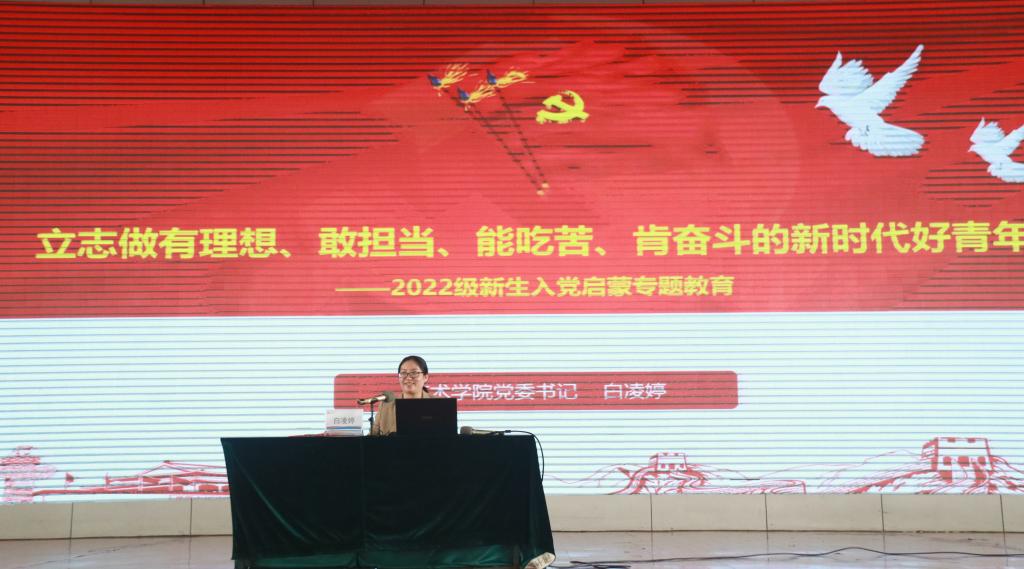 为进一步加强党的政治建设,落实立德树人根本任务,深化大学生理想信念教育,引领新生扣好人生第一粒扣子,艺术学院于10月26日在雁山校区综合训练馆组织开展了2022级新生入党启发教育活动,本次活动由艺术学院党委书记白凌婷主讲。