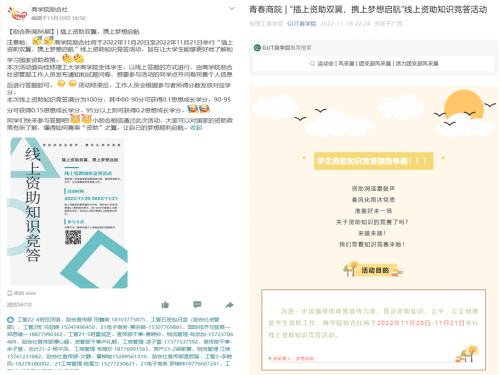 为积极宣传国家资助政策与成效,充分展示商学院学生在国家资助政策帮助下自立自强、明德感恩的青春风采,进一步营造形式多样、积极向上的校园文化氛围,商学院于11月20日至11月21日举办了线上资助知识竞答活动。