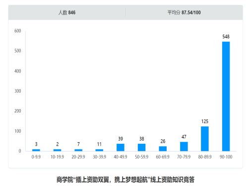 本次活动以线上答题的形式面向商学院全体学生展开。本次活动通过线上进行预热与宣传。活动开始后,同学们积极响应,形成了学习了解资助政策知识的浓厚氛围。活动过程中,同学们参与热情高涨,积极答题,大家纷纷表示,竞答活动进一步加深了自身对国家资助政策的了解。据统计,本次资助知识线上竞答活动参与人数总人数846人,其中满分(100分)332人,90分以上达64.77%,及格率达88%,平均分为87.54分。