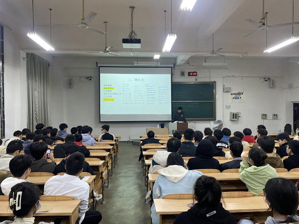 活动中,张事成围绕复习的方法、方式和心态三个方面开展。在复习方法上,他建议学弟学妹们掌握思维导图式的复习方法,让知识串联起来。在复习方式上,他建议大家尝试转换机械式刷题的复习方式,在做题的同时写出本题的知识点,强化对知识点的掌握深度。在复习心态上,他提出要通过锻炼等方式调适情绪,更好应对学习和复习的压力。梁华将则以高数科目的复习备考为重点进行阐释。其一,要将高数科目中所涉及的公式熟记于心,便于灵活运用;其二,在做题备考过程中要有耐心,逐步解析清楚关键题目的计算过程,在做题中思考,在思考中夯实知识;其三,不轻言放弃,始终保持自信,相信自己终将在高数备考中取得胜利。