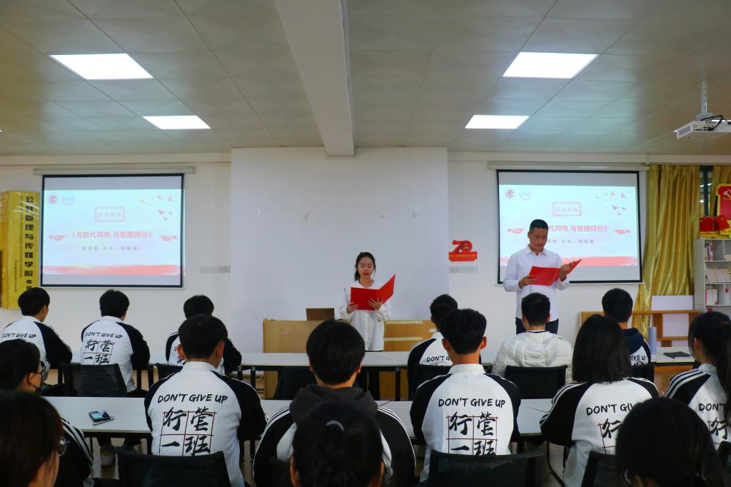 会上,班主任奉海春分享践行党的二十大精神,并结合当前国内外时政热点巩固了同学们对党的二十大精神的理解和掌握,进一步培育了爱国爱党的情怀,勉励同学们要踔厉奋发、勇毅前行、成为有理想、有本领、有担当的时代好青年。接着,学生代表王凯、陆铭晶以饱满的精神、激昂的语言、真挚的情感进行了朗诵表演,回顾党的百年之路,讴歌党的丰功伟绩,表达对党的崇敬意,生动展示当代大学生朝气满怀的精神风貌。随后,自强之星李家松同学进行经验分享,他结合研支团竞选和互联网参赛的获奖过程,以自身经历向同学们讲述了大学四年努力奋斗的诸多宝贵经验,并与同学们进行了互动交流。