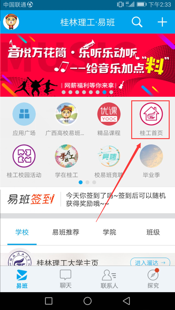步骤一:打开易班手机客户端,点击“桂工首页”轻应用