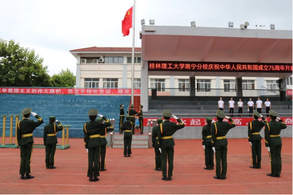 为庆祝中华人民共和国成立75周年,引导广大师生厚植爱国情怀,砥砺强国之志,实践报国之行,10月1日上午,学校在屏风校区、雁山校区和空港校区同步举行升旗仪式。学校党委书记邓军、党委副书记吴志强出席升旗仪式。学校党委宣传部、党办校办、法务办、学工部(处)、团委、研工部、南宁分校主要负责人,各学院分管学生工作的党委副书记、辅导员,全体2023级学生、2024级新生参加仪式,共庆中华人民共和国成立七十五周年。