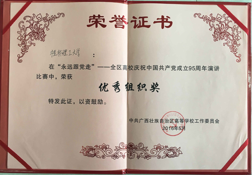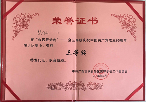 5月28日,“永远跟党走”——全区高校庆祝中国共产党成立95周年演讲比赛在广西民族大学举行,来自全区55所高校的55名选手参加了比赛,我校参赛选手地球科学学院学生党员颜培天同学荣获比赛三等奖,学校获优秀组织奖。