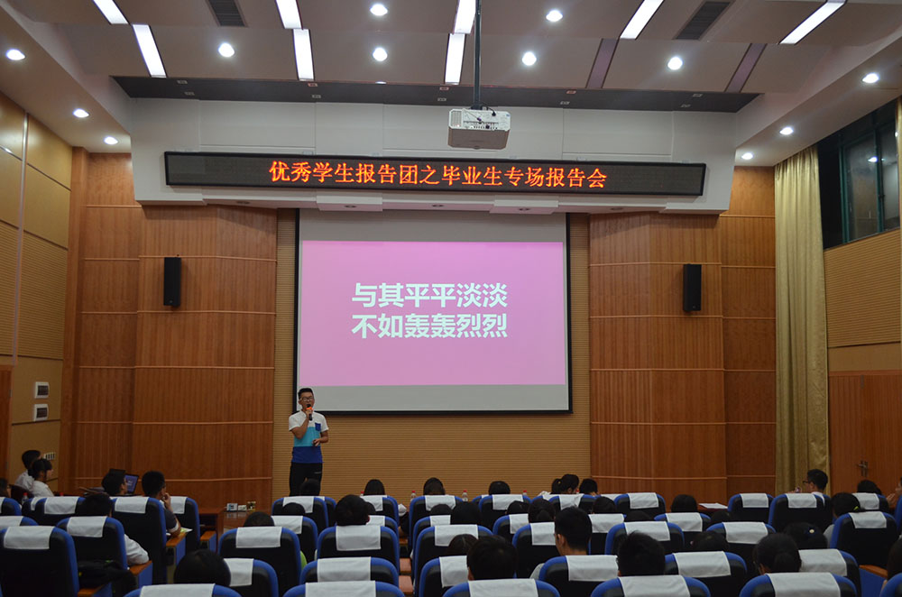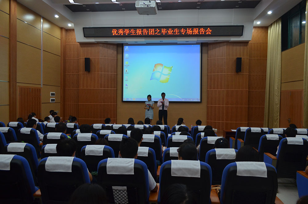 为及时总结和宣传先进典型经验,扎实推进“标杆工程”,调动各类优秀学生的主动性、积极性,充分发挥各类先进典型的示范引导作用,营造崇尚先进、学习先进、争当先进的良好风气,2014年6月3日晚,由学工部(处)主办,学生工作助理中心承办的本年度优秀学生报告团毕业生专场宣讲会在雁山校区12栋教学楼报告厅举行。学工处邝宏达老师、相关学生组织负责人及学生参加了本次宣讲会。
