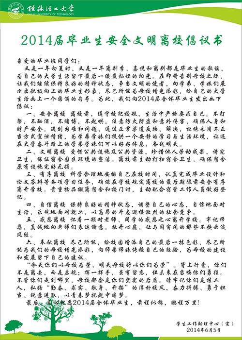 为配合做好我校2014届毕业生离校工作,给全体毕业生营造一个温馨祥和的毕业氛围,确保学生宿舍的和谐稳定。近期,学生工作助理中心社区管理部向2014届毕业生发出“安全文明离校”倡议,并制作了倡议书张贴在我校各学生宿舍楼栋宣传栏。