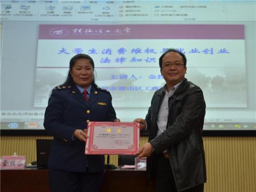 在报告中,金副局长从国家近期鼓励大学生创业的相关政策、办企业所需要的掌握的法律知识以及大学生消费维权等三个方面进行了详细的阐述,讲座内容贴近大学生生活实际,讲授的案例将法律知识与实际应用相结合,生动丰富,具有很强的吸引力和感染力。本次专题报告会既丰富了同学们消费维权的相关法律知识,也为同学们依法创业、合法经营提供了有效的指导。会上,金副局长还与同学们就大学生创业扶持政策及消费维权等问题进行了互动交流。