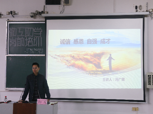 培训会上,冯老师围绕着诚信、感恩、自强、成才四大模块进行详细讲解。他首先强调,做人一定要诚信,“言必行,行必果”,强调作为一名大学生,不仅要学习各种科学文化知识,更重要的是具备良好的人格品质,而良好的品质之首便是诚信。其次要求同学们一定要懂得感恩,他指出,国家不断加大对高校贫困生资助的力度,作为当代大学生,应该具备高度责任感,努力拼搏,立志成才,始终对国家和社会心怀感恩。最后,在自强与成才方面,他指出,自强是成才的前提,成才是自强的必然。“立学以读书为本。”一个人能否成才,取决于自己。同时结合就业问题提醒同学们学习要有先见性,要懂得随时代变化而学习。