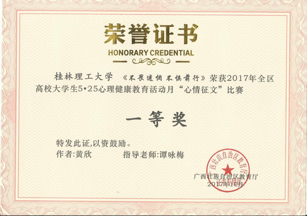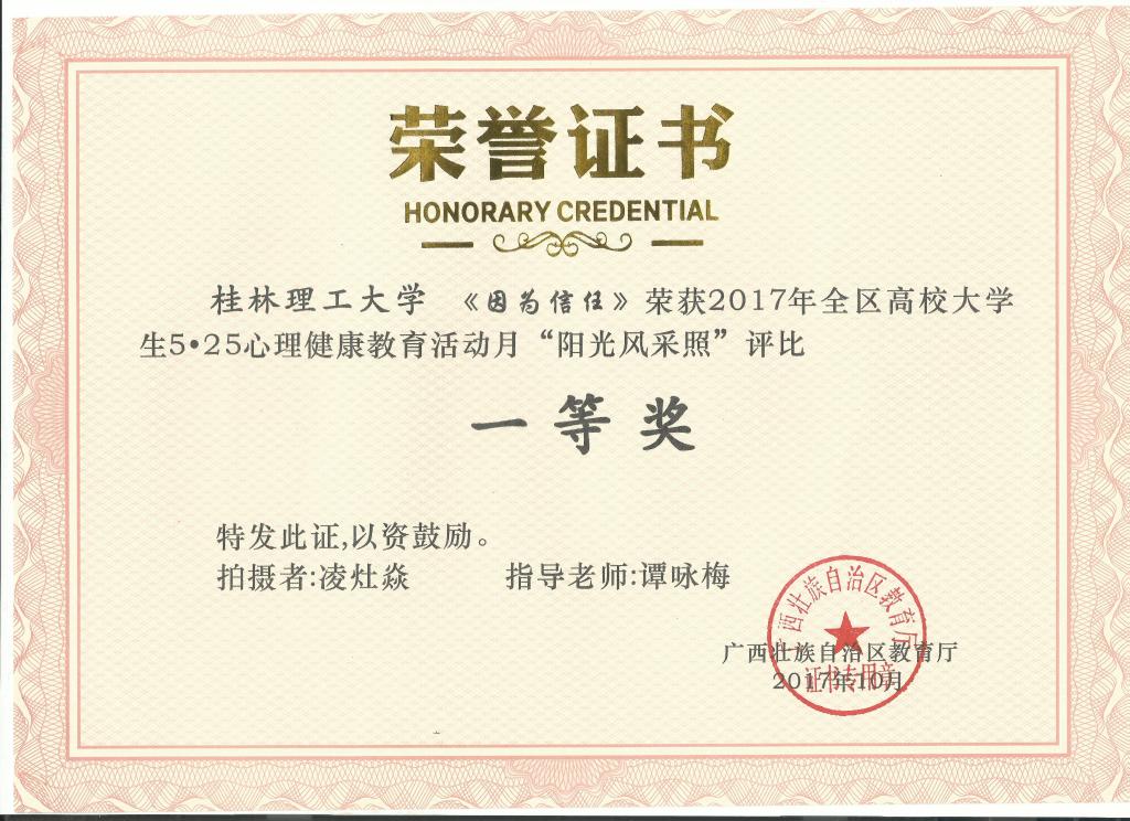 2017年5至6月,广西壮族自治区教育厅、高工委开展了2017年广西高校大学生心理健康活动月系列比赛活动,我校根据文件精神,周密部署、精心组织。在此次活动月中,我校举办的《“心悦读”大型心理朗读活动》(项目负责人:谭咏梅;项目组成员:谭咏梅、李海亮、凌灶焱、郑红、王清)荣获2017年全区高校大学生心理健康教育活动月“特色项目”评比“二等奖”。举行了“心情征文”比赛,其中,作品《不畏迷茫不惧前行》(作者:黄欣,指导老师:谭咏梅)荣获全区高校比赛“一等奖”,作品《秋枫落雨化晨曦》(作者:高勇,指导老师:梁译匀)荣获“二等奖”;还举行了“阳光风采照”评比,其中,作品《因为信任》与《拥抱》分别获得全区评比“一等奖”和“三等奖”(作者:凌灶焱,指导老师;谭咏梅、李海亮)。另外,我校谭咏梅老师在2017年全区高校心理健康活动月中被评为“阳光风采照”和“心情征文”优秀指导老师奖。