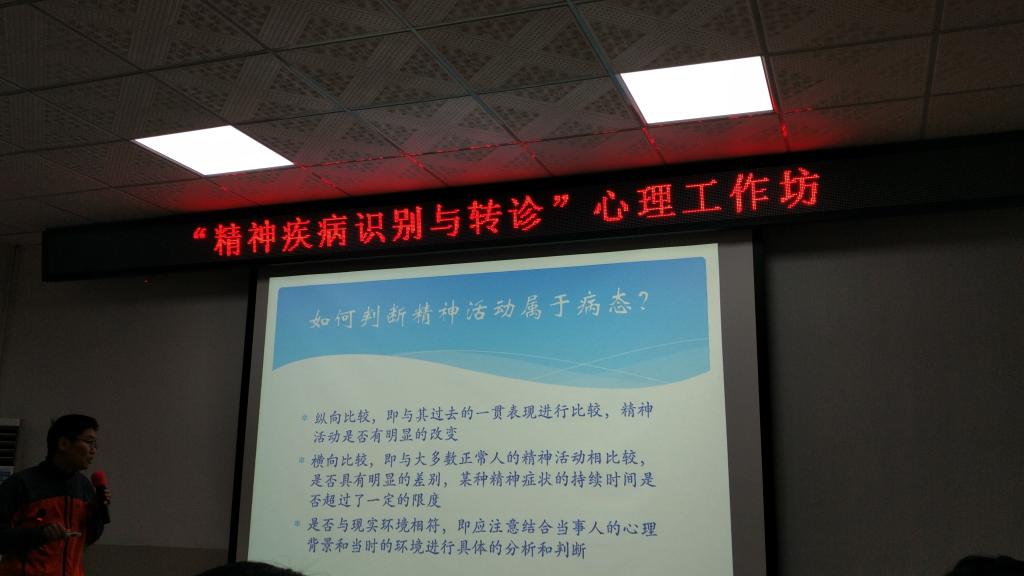 赵医生以提问切入主题:什么是精神障碍?如何判断精神活动属于病态?围绕着这两个问题,赵医生为大家普及心理卫生知识:“精神障碍是一类具有诊断意义的精神方面的问题,特征是认知、情绪、行为方面的改变,可伴有痛苦体验和功能损害。”目前我国精神病性障碍约有1600万,抑郁症患者有3000万,解决精神卫生问题刻不容缓。接着,赵医生还给大家介绍了精神障碍的分类与各类病症的诊断标准,让大家对精神障碍有了更多的了解。