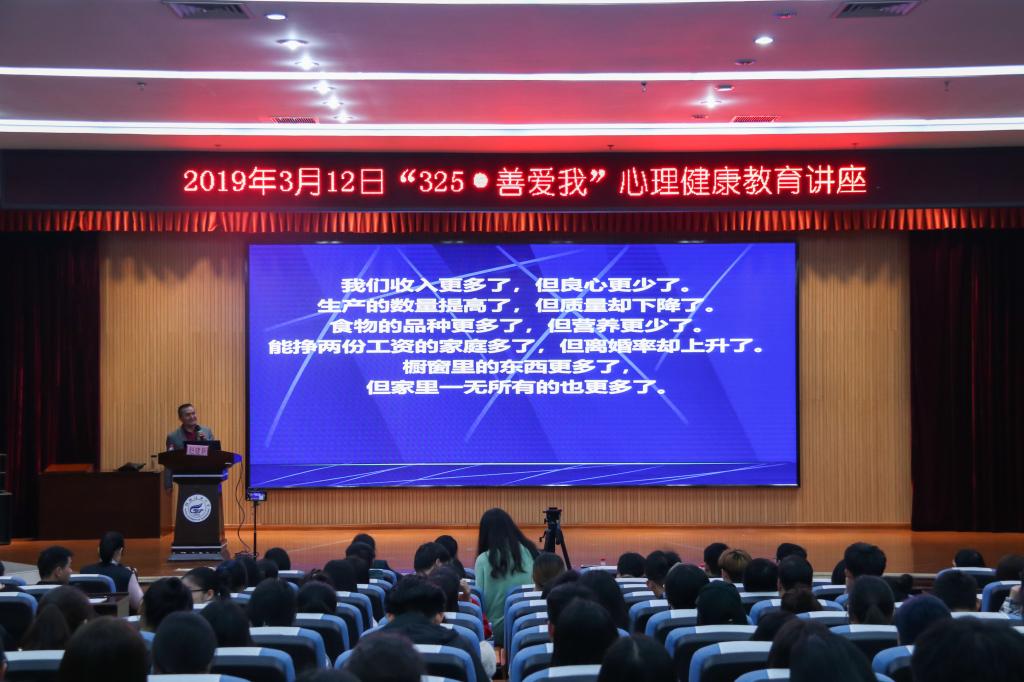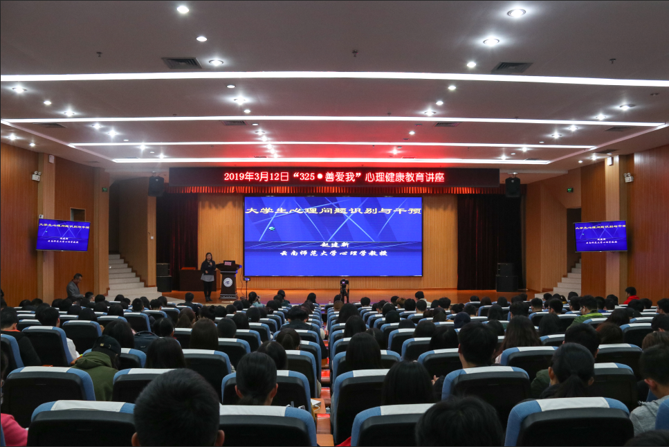 3月12日晚,2019年“325·善爱我”心理健康教育讲座,在雁山校区图书馆报告厅顺利举办。本次讲座,英国上市公司365心理健康教育与咨询中心,邀请了云南师范大学心理学教授赵建新作为主讲人,为我校学生开展“大学生心理问题识别与干预”讲座。心理健康教育与咨询中心谭咏梅老师、肖梦洁老师、邓金萍老师、杨周健老师与各学院辅导员以及朋辈工作室助理和各年级心理委员共同参加了此次讲座。本次活动由心理健康教育与咨询中心主任谭咏梅老师主持,并在网络上进行同步直播。