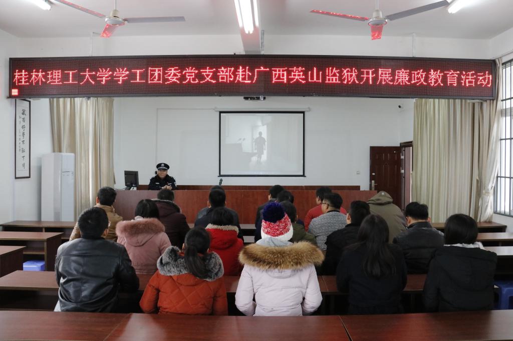 为深入推进党风廉政建设和反腐败工作,进一步增强党员干部廉洁自律意识,切实提高拒腐防变能力,根据自治区教育厅及学校廉政教育活动的相关通知精神,结合学工团委党支部“全国党建工作样板支部”要求,在学校纪委的部署和指导下,12月14日上午,校团委书记、学工团委党支部副书记周国桥带领党支部一行23名党员,赴英山监狱开展廉政警示教育活动。